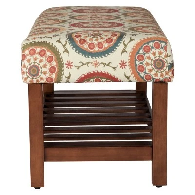 This Homepop Entryway Bench is both stylish and practical with an upholstered top and wooden plank storage shelf underneath. Put this bench to work in an entryway to hold accessories when guests visit, in a mudroom as a place to sit while putting on shoes, or as an end of bed bench to hold extra blankets or pillows. Complemented by a wood frame and shelf in a range of wood finishes, upholstered bench with storage is easy to assemble and maintain.