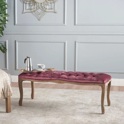 Give any room in your home a touch of sophistication with this Tassia New Velvet Tufted Bench from Christopher Knight Home. The plush, tufted upholstery sits atop delicately detailed legs crafted from sturdy rubberwood. This elegant velvet bench adds a hint of luxury to your space no matter where you place it. You’ll love sinking into its cushioned comfort, whether you’re using it in the living room opposite a sofa, or in your home office to tie your space together.