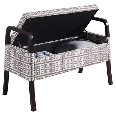 A clean, Mid-Century contemporary, plush-smooth top Greek Keyline print storage bench is ideal for pairing with your existing family room furnishings. Upholstered in durable, easy-to-clean polyester/cotton blend in your choice of prints and patterns, top easily lifts to reveal large storage compartment. This stylish ottoman is custom designed for discreet blanket, pillows, throws or quilts storage. Mid-Century storage ottoman accentuated with espresso wood handle bar align with the flare legs add contemporary flair for a quick way to update your family room.